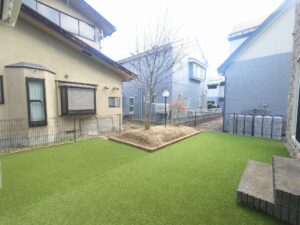 人口芝を新設した広い庭は手入れもしやすくお子様の遊び場としても活用できます